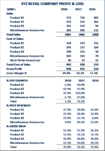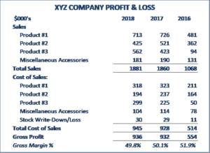 What do we now see? Product 1 revenue has gone down slightly, Product 2 reduced hugely, and Product 3 is growing. Costs have also reduced, so it’s a bit hard to know what to recommend, particularly if you’re not a numbers person!